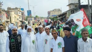 कुचामन शहर की गलियों और रास्तों से गुज़रते हुए जुलूस में हजारों मुस्लिम धर्मावलंबी शामिल हो रहे हैं। बच्चे, युवा, जवान और बुज़ुर्ग—हर कोई “मुहब्बत-ए-मुस्तफ़ा” के जज़्बे से सराबोर नज़र आ रहा है। जुलूस में “या रसूलल्लाह” के नारे गूंज रहे हैं और माहौल इश्क़-ए-रसूल की रौनक से भर गया है।