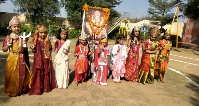 कार्यक्रम का शुभारम्भ मां दुर्गा की आरती एवं 9 छोटी-छोटी कन्याओं के पूजन से हुई। कन्याओं को माता का स्वरूप मानकर सम्मान स्वरूप उपहार भी भेंट किए गए। इस अवसर पर बच्चों ने पारंपरिक परिधानों में विभिन्न डांडिया गीतों की धुन पर उत्साह पूर्वक नृत्य प्रस्तुत किया।