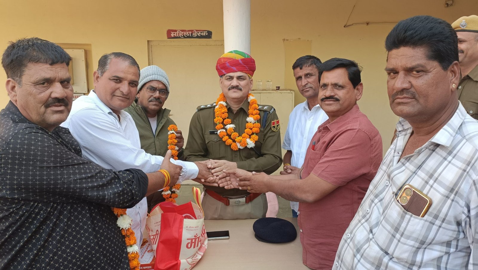 नावां शहर के पुलिस थाने में शनिवार को वृत्ताधिकारी मुकेश चौधरी का शहरवासियों ने माला व साफा पहनाकर स्वागत किया।
