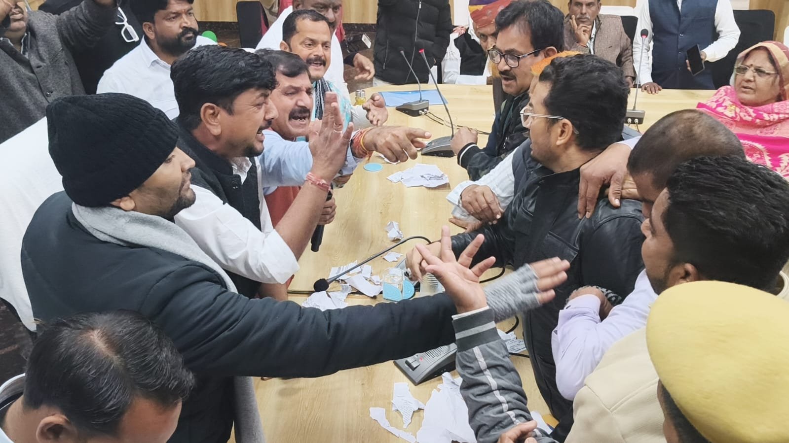 इस विरोध ने बैठक का माहौल और भी उग्र बना दिया और सुरक्षा कर्मियों को बीच-बचाव करना पड़ा। कांग्रेस नेताओं ने सभापति सुरेश सिखवाल और आयुक्त शिकेश कांकरिया पर मनमर्जी चलाने के आरोप लगाए। सभापति के पास उनकी कुर्सी तक पहुंचे विपक्षी नेताओं ने उन्हें घेर लिया। बचाव में बीजेपी के अन्य नेताओं को भी आना पड़ा।