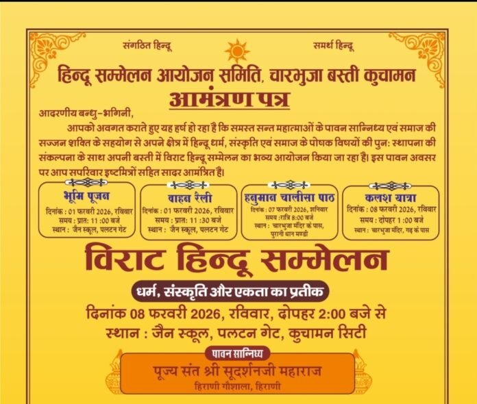 कुचामन सिटी. राष्ट्रीय स्वयंसेवक संघ के शताब्दी वर्ष के अवसर पर देशभर में आयोजित हिंदू सम्मेलन कार्यक्रमों की श्रृंखला के तहत कुचामन नगर की चारभुजा बस्ती में सर्व हिंदू समाज द्वारा विराट हिंदू सम्मेलन का आयोजन किया जा रहा है।