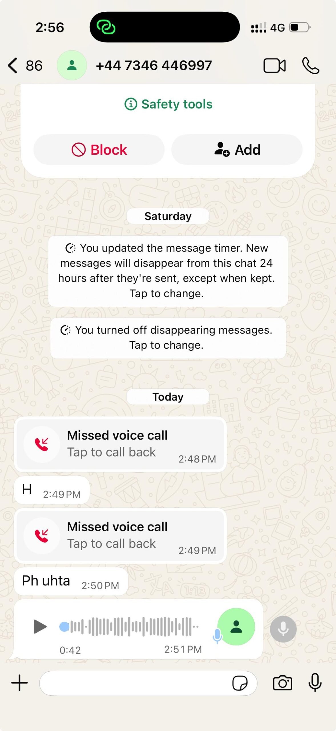 आज सोमवार दोपहर 2:48 बजे एक व्हाट्सएप कॉल आया। उसके तुरंत बाद मैसेज किया गया। अगले ही सेकंड दोबारा वॉयस कॉल आया, फिर मैसेज लिखा गया कि “फोन उठा।”