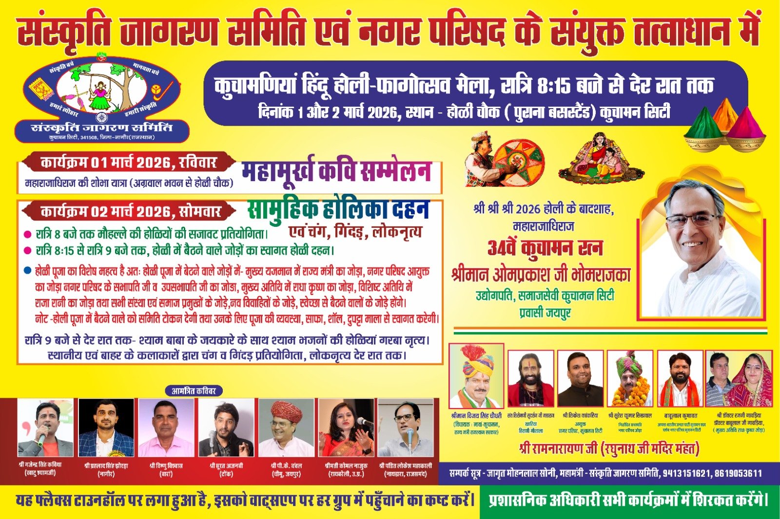 कुचामन सिटी में 1 मार्च को कवि सम्मेलन, 2 मार्च को होली-फागोत्सव का भव्य आयोजन